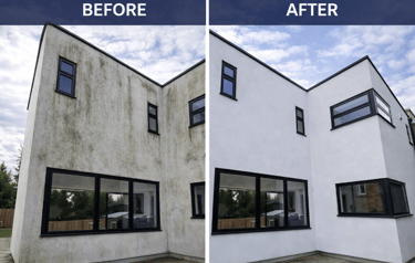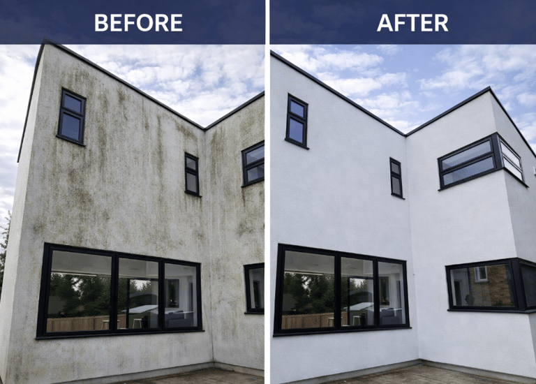 Soft washing using safe, low-pressure methods to remove algae, moss, and staining from render, leaving your property looking clean and refreshed without damage.